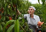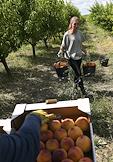 Жанровая фотография. Сбор урожая персиков. Картонная тара для упаковки персиков.