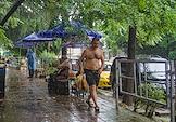 Виды Сочи во время дождя. Жанровая фотография. Мужчина в шортах идет под дождем.