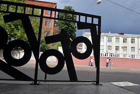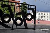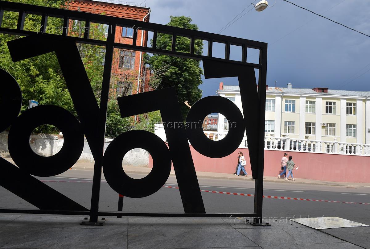 Виды Москвы. Жанровая фотография. Снятие вывесок "Гоголь-центра" со здания Театра имени Гоголя. Декоративная конструкция с логотипом "Гоголь-центра возле здания театра.