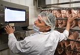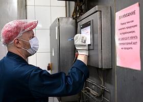 Пресс-тур на Лыткаринский мясоперерабатывающий завод. Сотрудник завода во время проверки оборудования.