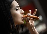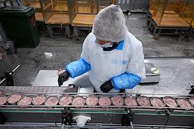 Пресс-тур на Лыткаринский мясоперерабатывающий завод, входящий в группу компаний "РУЗКОМ". Сотрудник завода в цеху по производству сосисок.