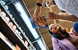 Магазин торговой сети "Пятерочка". Жанровая фотография. Покупатели у витрины с рыбной продукцией.