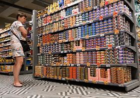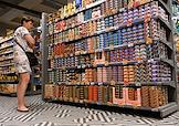 Магазин торговой сети "Пятерочка". Жанровая фотография. Покупательница у витрины с консервами.