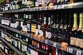 Магазин торговой сети "Пятерочка". Жанровая фотография. Витрина винного отдела магазина.