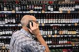 Магазин торговой сети "Пятерочка". Жанровая фотография. Покупатель в винном отделе.