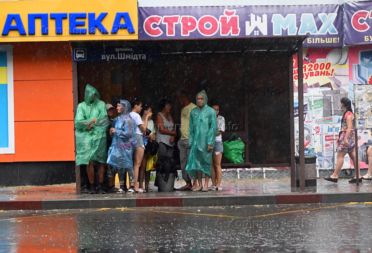 Views of Melitopol. Genre photography. Passers-by during the rain at a public transport stop.