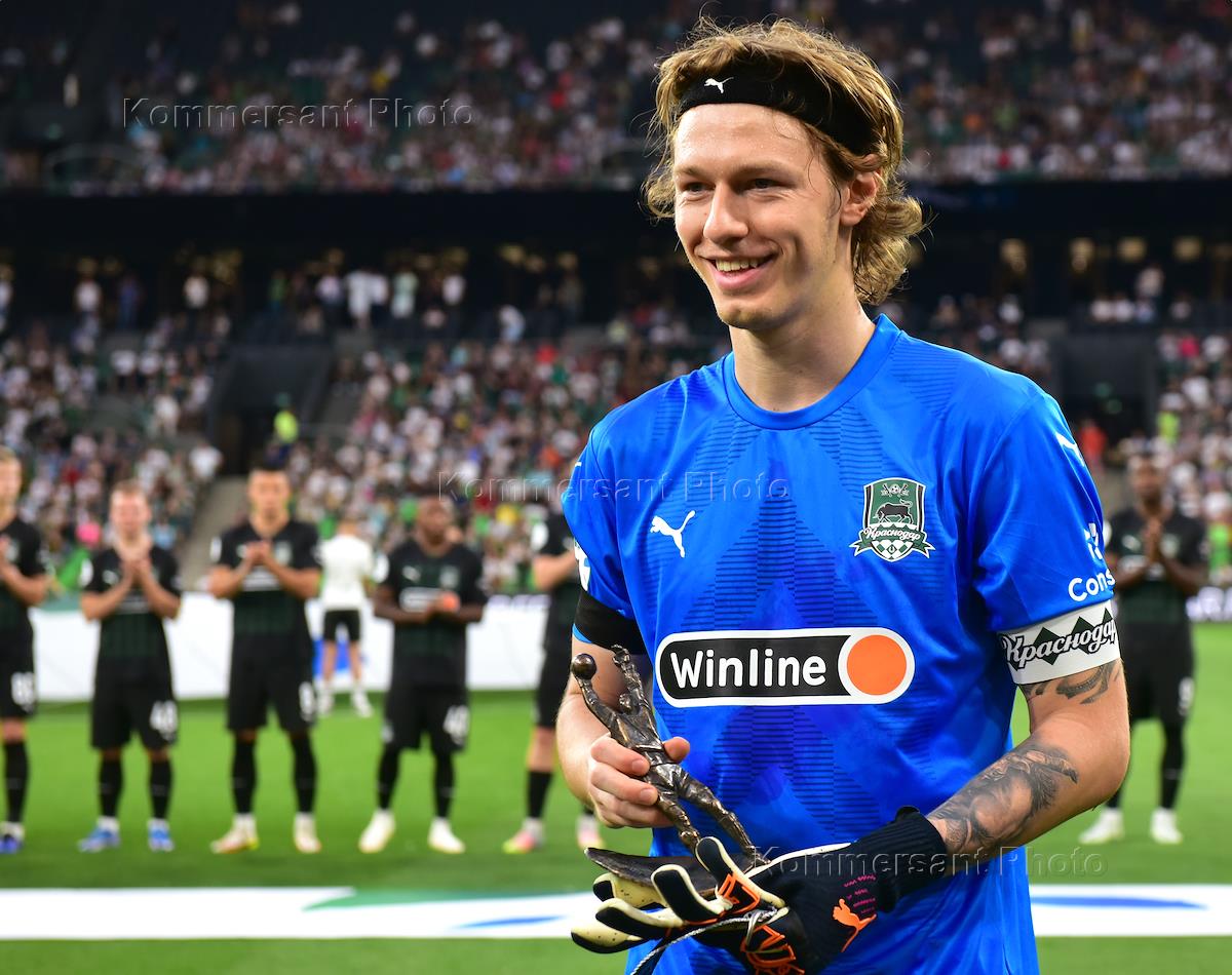 Мир-Российская Премьер-Лига (РПЛ) 2022/2023. 1-й тур. Матч между командами "Краснодар" (Краснодар) – "Факел" (Воронеж) на стадионе "Арена Краснодар". Церемония вручения премии "Вратарь года" им. Льва Яшина. Вратарь команды "Краснодар" Матвей Сафонов во время церемонии.