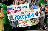 Мир-Российская Премьер-Лига (РПЛ) 2022/2023. 1-й тур. Матч между командами "Краснодар" (Краснодар) – "Факел" (Воронеж) на стадионе "Арена Краснодар". Болельщики с плакатом "Сафонов лучший вратарь России, подари футболку пацану из Крыма" на трибуне во время матча.