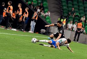 Мир-Российская Премьер-Лига (РПЛ) 2022/2023. 1-й тур. Матч между командами "Краснодар" (Краснодар) – "Факел" (Воронеж) на стадионе "Арена Краснодар". Игрок команды "Краснодар" Ильзат Ахметов (слева) и игрок команды "Факел" Ильнур Альшин (справа) во время матча.