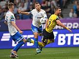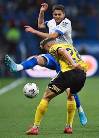 Мир-Российская Премьер-Лига (РПЛ) 2022/2023. 1-й тур. Матч между командами "Динамо М" (Москва) - "Ростов" (Ростов-на-Дону) на стадионе "ВТБ Арена - Центральный стадион Динамо им. Льва Яшина". Игрок команды "Динамо" Федор Смолов (слева) и игрок команды "Ростов" Данила Прохин (справа) во время матча.