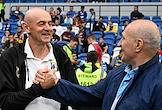 Мир-Российская Премьер-Лига (РПЛ) 2022/2023. 1-й тур. Матч между командами "Динамо М" (Москва) - "Ростов" (Ростов-на-Дону) на стадионе "ВТБ Арена - Центральный стадион Динамо им. Льва Яшина". Футбольный тренер Юрий Семин (слева) и президент компании "Автотор Холдинг" Валерий Драганов (справа) на трибуне перед началом матча.