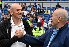 Мир-Российская Премьер-Лига (РПЛ) 2022/2023. 1-й тур. Матч между командами "Динамо М" (Москва) - "Ростов" (Ростов-на-Дону) на стадионе "ВТБ Арена - Центральный стадион Динамо им. Льва Яшина". Тренер команды "Ростов" Виктор Онопко (слева) перед началом матча.