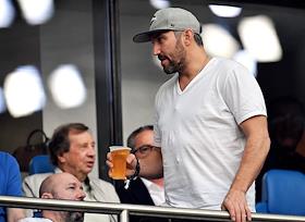 Мир-Российская Премьер-Лига (РПЛ) 2022/2023. 1-й тур. Матч между командами "Динамо М" (Москва) - "Ростов" (Ростов-на-Дону) на стадионе "ВТБ Арена - Центральный стадион Динамо им. Льва Яшина". Хоккеист Александр Овечкин (справа) на трибуне во время матча.