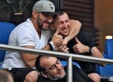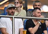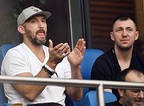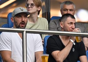 Мир-Российская Премьер-Лига (РПЛ) 2022/2023. 1-й тур. Матч между командами "Динамо М" (Москва) - "Ростов" (Ростов-на-Дону) на стадионе "ВТБ Арена - Центральный стадион Динамо им. Льва Яшина". Хоккеист Александр Овечкин (слева) и баскетболист Виталий Фридзон (справа) на трибуне во время матча.