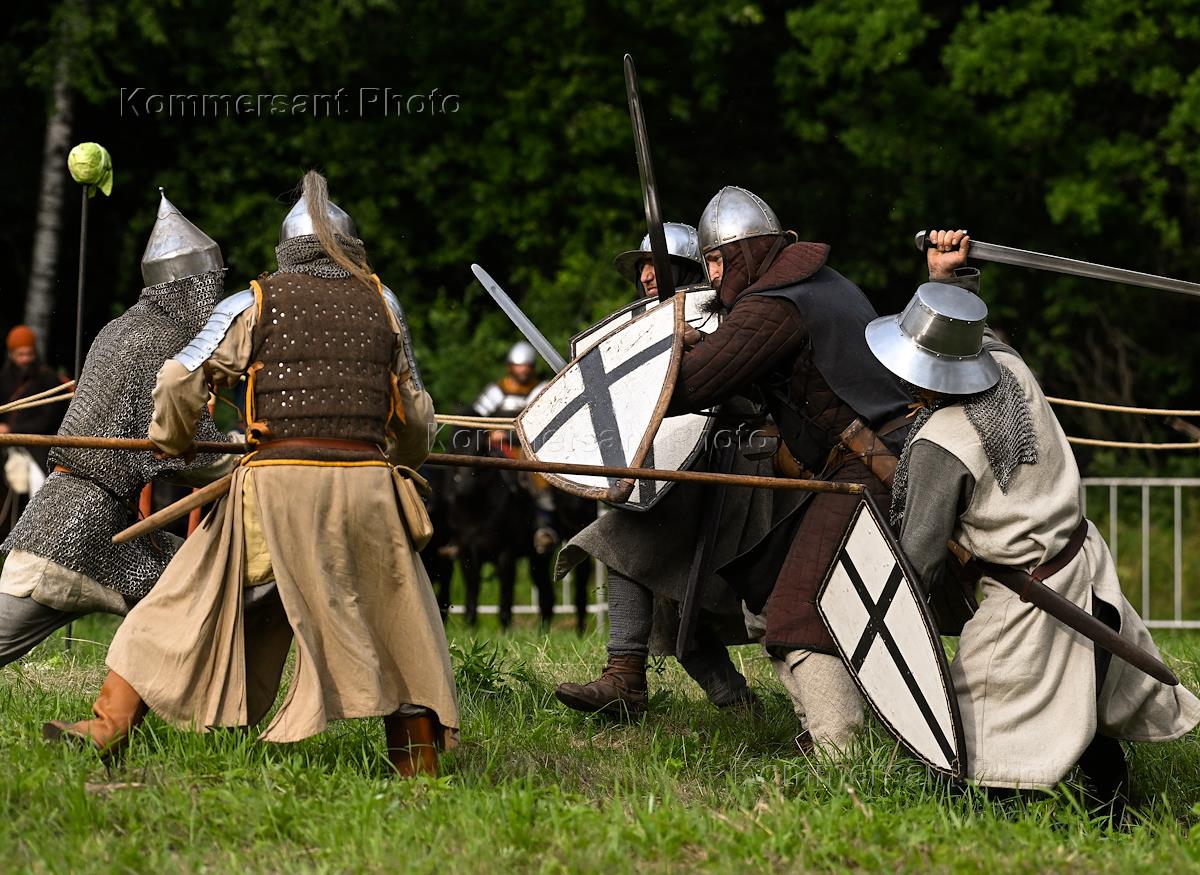Историческая реконструкция похода Александра Невского 1241-1242 годов "Александрова дорога", посвященная 780-летию Ледового побоища на Чудском озере, на территории эколого-просветительского центра "Русский быт" в национальном парке "Лосиный Остров". Жанровая фотография. Участники реконструкции с мечами для боя.