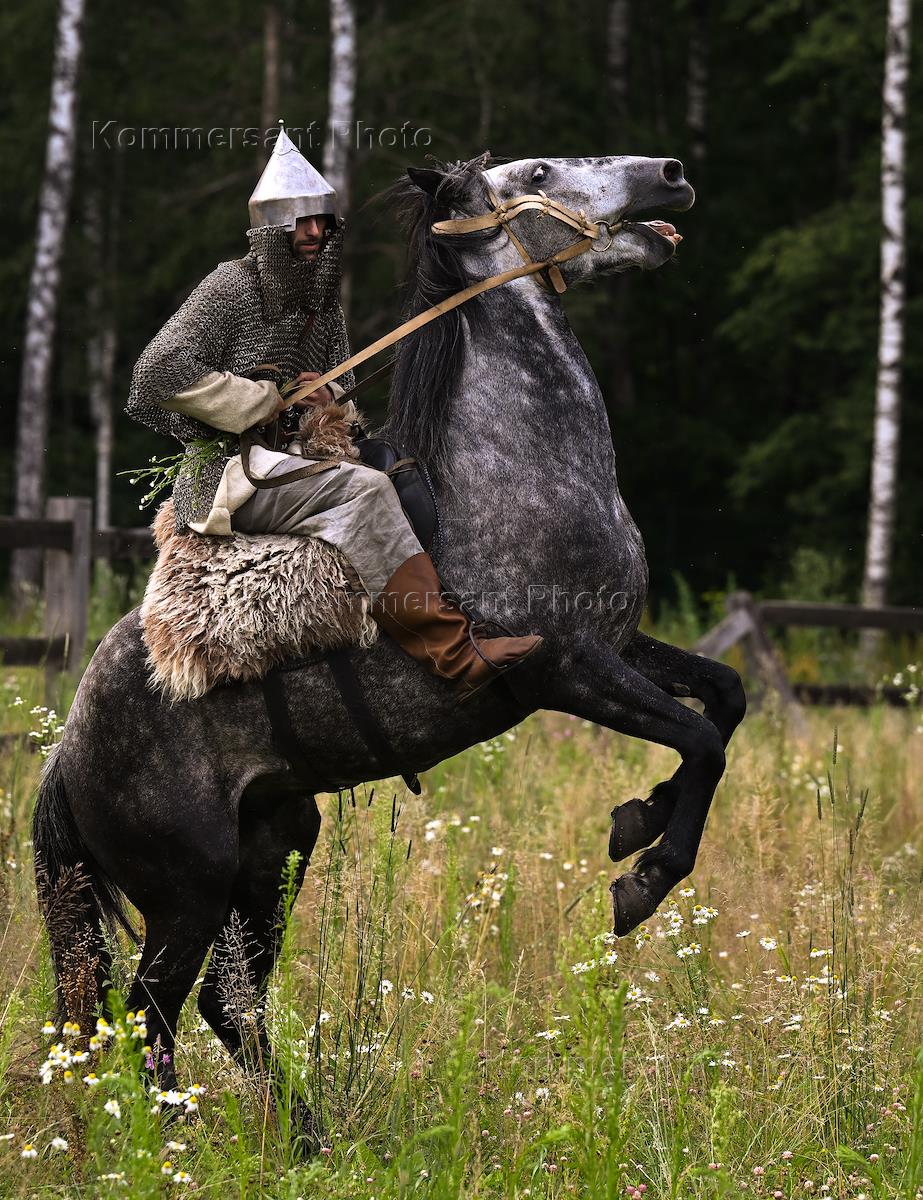 Историческая реконструкция похода Александра Невского 1241-1242 годов "Александрова дорога", посвященная 780-летию Ледового побоища на Чудском озере, на территории эколого-просветительского центра "Русский быт" в национальном парке "Лосиный Остров". Жанровая фотография. Участник реконструкции с лошадью.