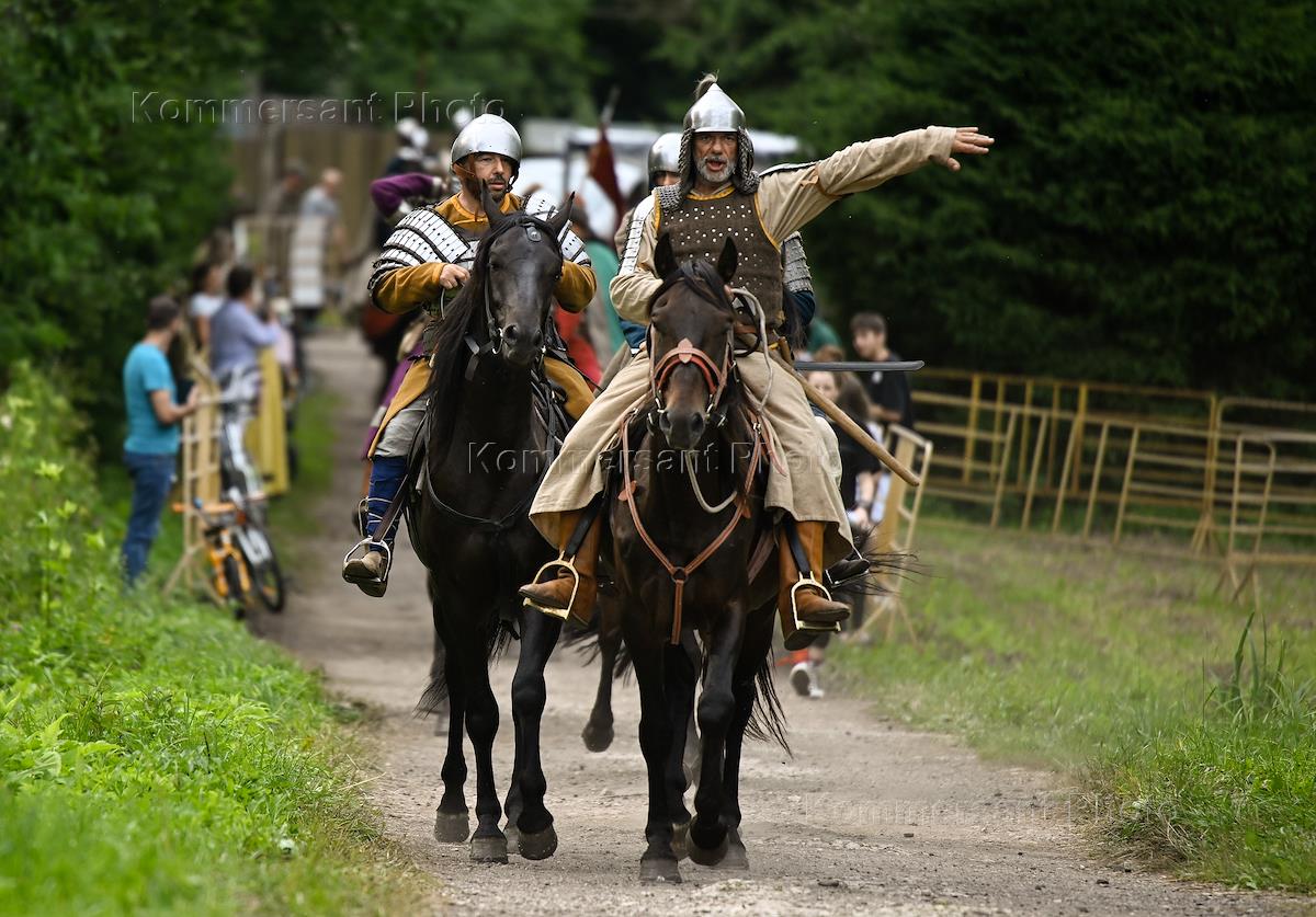 Historical reconstruction of Alexander Nevsky's 1241-1242 campaign "Alexander's Road", dedicated to the 780th anniversary of the Battle on the Ice on Lake Peipus, on the territory of the Russian Life environmental and educational center in the Losiny Ostrov national park. Participants of the reconstruction during a demonstration equestrian battle.