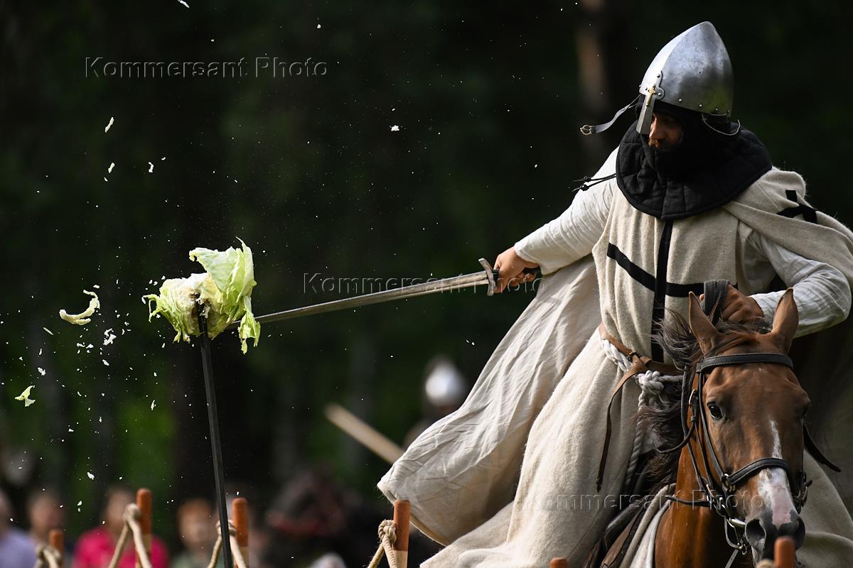 Историческая реконструкция похода Александра Невского 1241-1242 годов "Александрова дорога", посвященная 780-летию Ледового побоища на Чудском озере, на территории эколого-просветительского центра "Русский быт" в национальном парке "Лосиный Остров". Участник реконструкции во время показательного конного боя.