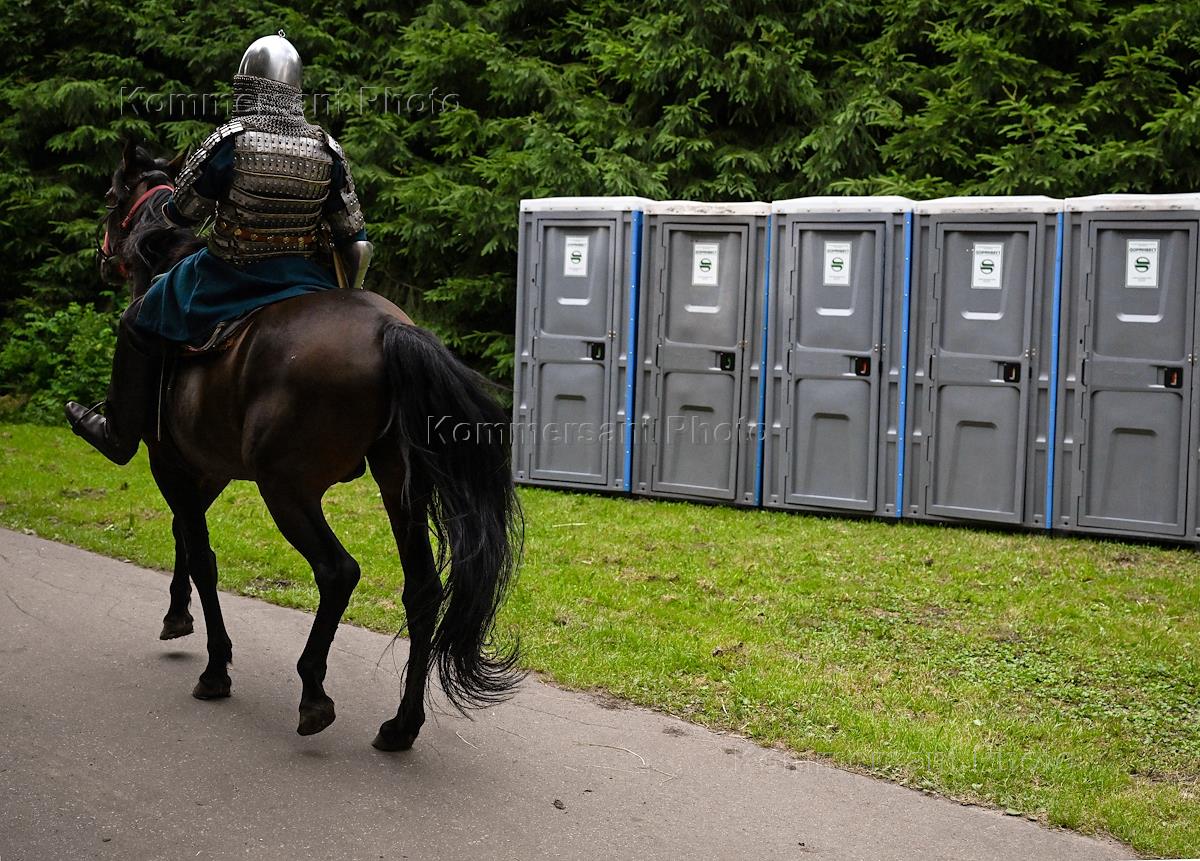 Historical reconstruction of Alexander Nevsky's 1241-1242 campaign "Alexander's Road", dedicated to the 780th anniversary of the Battle on the Ice on Lake Peipus, on the territory of the Russian Life environmental and educational center in the Losiny Ostrov national park. Member of the reconstruction before the equestrian battle. Genre photography. Toilet cubicles for spectators and participants.