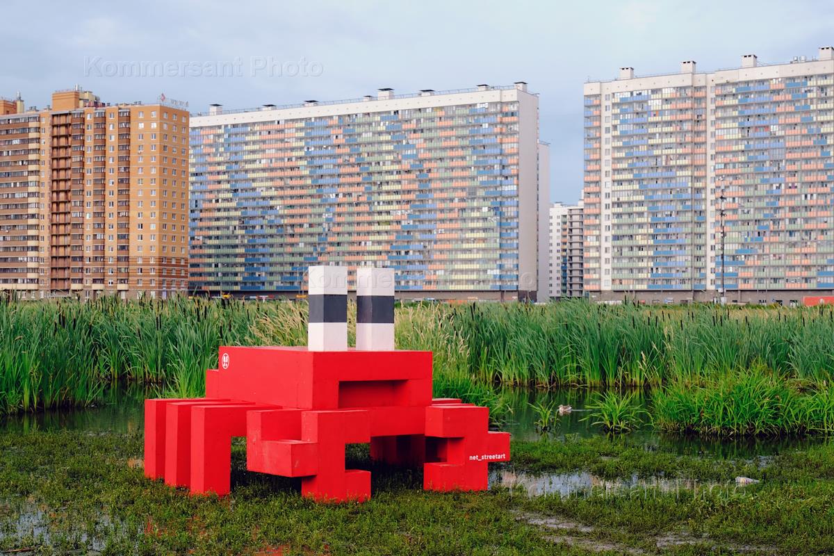 Voxel installation "Crab Thinking" by Net Streetart artists in a field between Murino and Bugry. Genre photography. Residents are photographed against the backdrop of the installation.