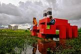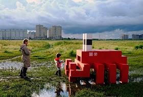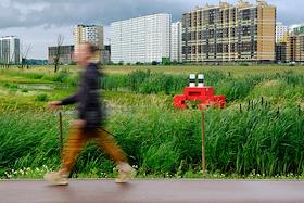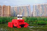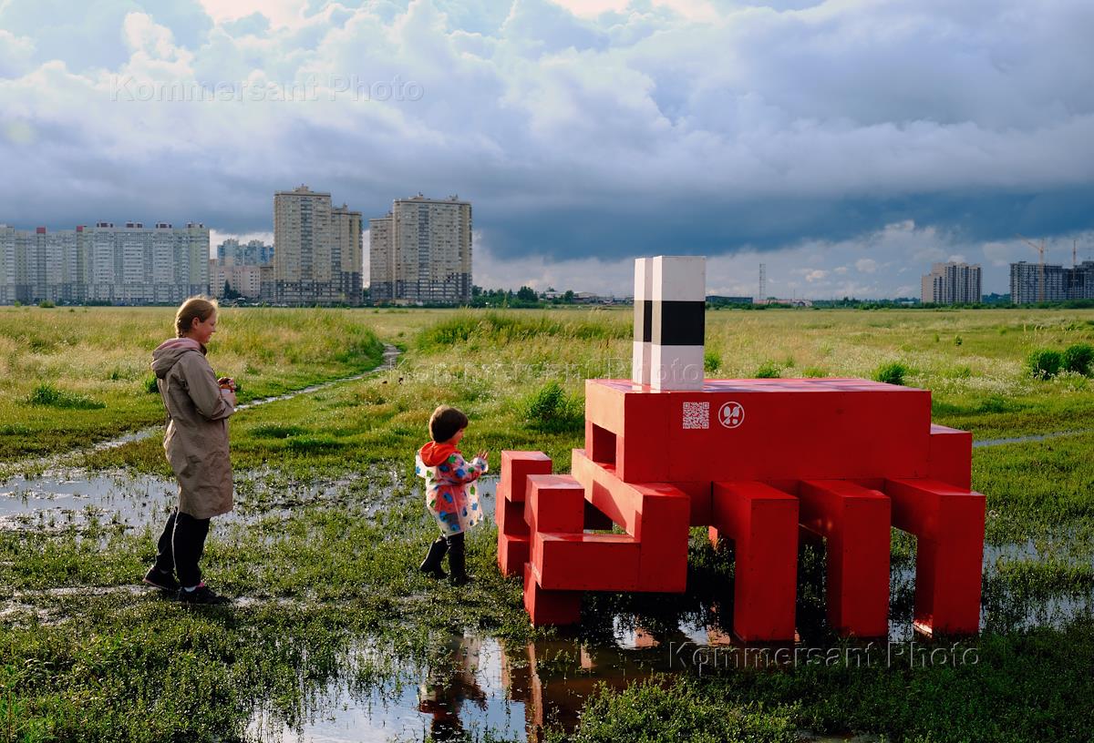 Voxel installation "Crab Thinking" by Net Streetart artists in a field between Murino and Bugry. Genre photography. Children play at the installation.