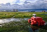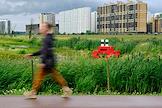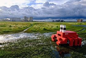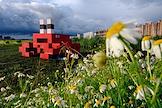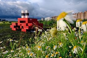 Voxel installation "Crab Thinking" by Net Streetart artists in a field between Murino and Bugry. Genre photography.