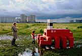Voxel installation "Crab Thinking" by Net Streetart artists in a field between Murino and Bugry. Genre photography. Residents are photographed against the backdrop of the installation.