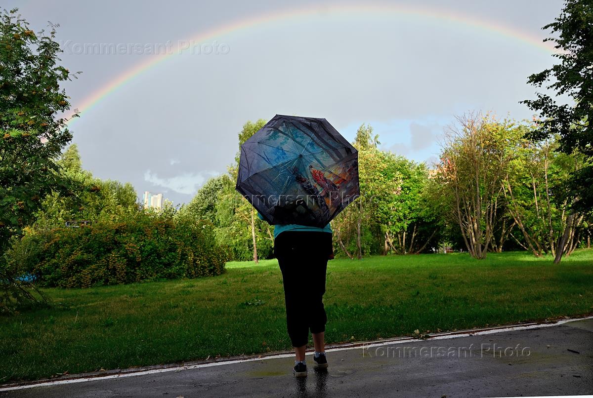 Views of Moscow. Genre photography. A visitor to the 50th Anniversary of October Park during a drone launch against the backdrop of a rainbow.