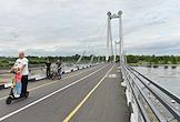 Виды Красноярска. Виноградовский подвесной вантовый пешеходный мост через протоку реки Енисей.