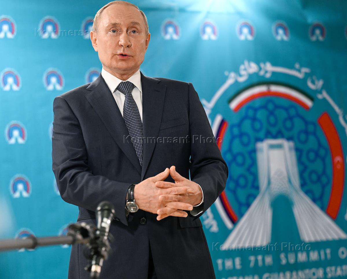 Рабочая поездка президента России Владимира Путина в Иран. Президент России Владимир Путин отвечает на вопросы журналистов после трехсторонней встречи глав государств – гарантов Астанинского процесса содействия сирийскому урегулированию в Международном конгресс-центре.