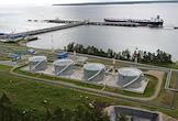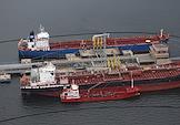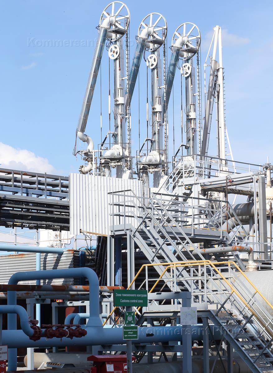 Специализированный морской нефтеналивной порт "Приморск", конечная точка магистральных нефтепроводов Балтийской трубопроводной системы, расположенный на материковой части пролива Бьёркезунд Финского залива Балтийского моря. Жанровая фотография. Бункеровочный комплекс для заправки судов топливом.