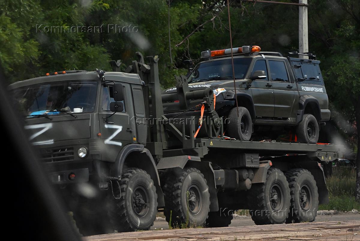 Ситуация в Мариуполе. Жанровая фотография. Военной грузовик перевозит автомобиль с надписью "Разминирование".