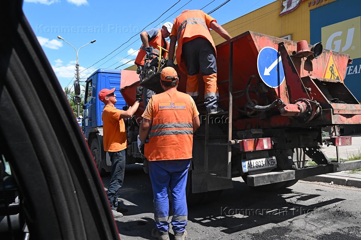 Ситуация в Мариуполе. Жанровая фотография. Ремонт дороги на одной из улиц города.