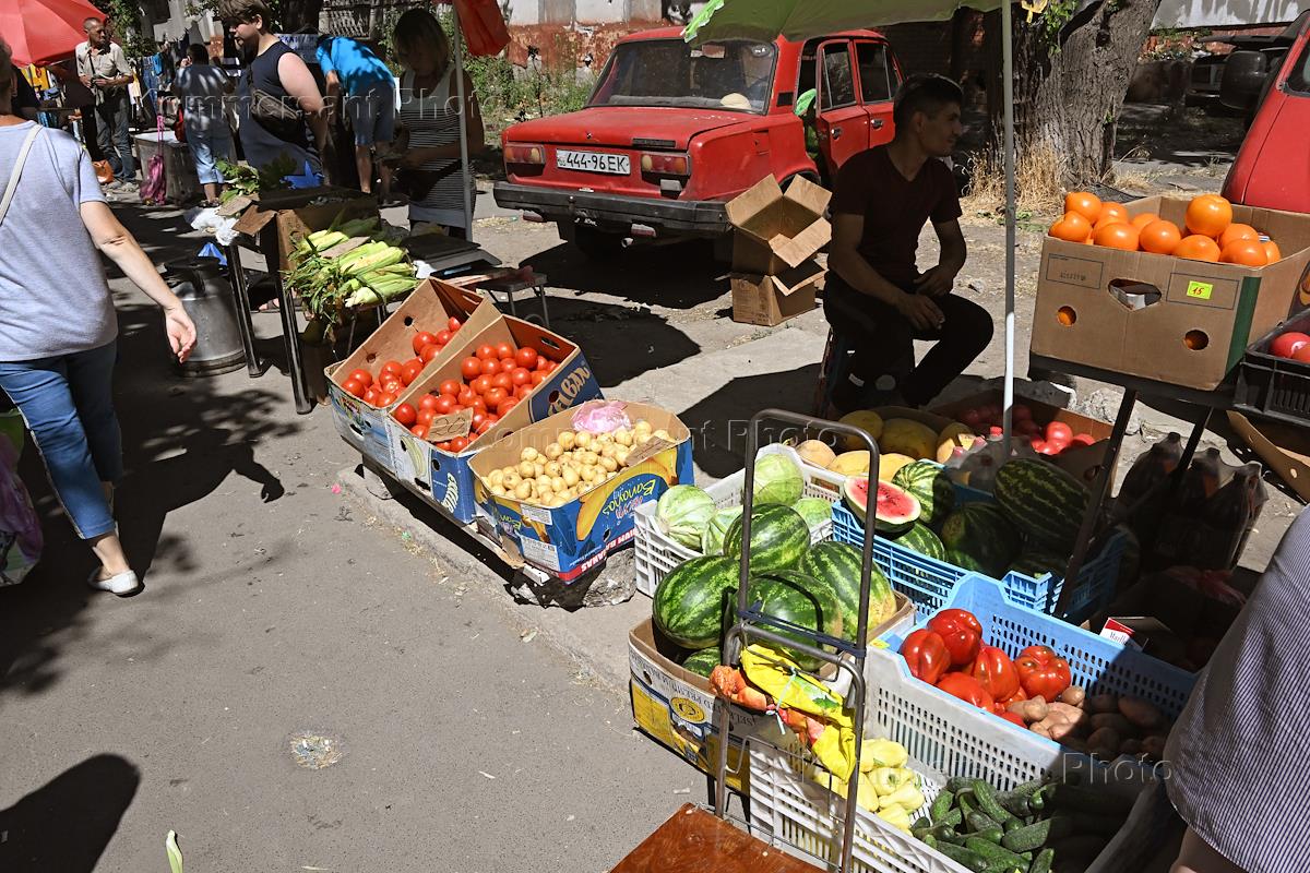 Ситуация в Мариуполе. Жанровая фотография. Торговля овощами и фруктами на рынке.