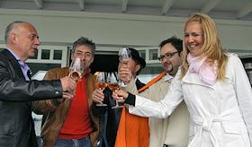Генеральный директор ООО "Компания "Симпл" Максим Каширин (второй слева), политик Андрей Козырев (слева), генеральный директор группы компаний "Конкор" Владимир Кононов (в центре), коммерческий директор ООО "Компания "Симпл" Анатолий Корнеев (второй справа) и телеведущая Юлия Бордовских (справа) на "Празднике Роз" в "Усадьбе у реки" (Дом Ивана Билютина).