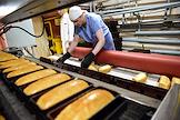 Работа хлебного комбината "Хлебообъединения "Восход" в Новосибирске. Жанровая фотография. Готовый хлеб в цехе нарезки и упаковки. Работник загружает булки белого хлеба в аппарат для нарезки.