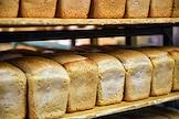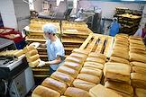 Работа хлебного комбината "Хлебообъединения "Восход" в Новосибирске. Жанровая фотография. Готовый хлеб в цехе нарезки и упаковки. Булки белого хлеба на стеллажах.