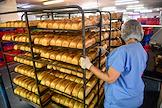 Работа хлебного комбината "Хлебообъединения "Восход" в Новосибирске. Жанровая фотография. Готовый хлеб в цехе нарезки и упаковки. Работник хлебзавода транспортирует стеллаж с готовой продукцией.