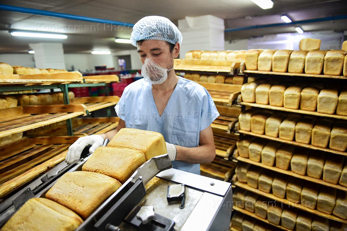 Работа хлебного комбината "Хлебообъединения "Восход" в Новосибирске. Жанровая фотография. Готовый хлеб в цехе нарезки и упаковки. Работник загружает булки белого хлеба в аппарат для нарезки.