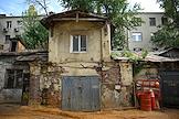 Виды Москвы. Жанровая фотография. Старый гараж с надстройкой во дворе жилого дома.