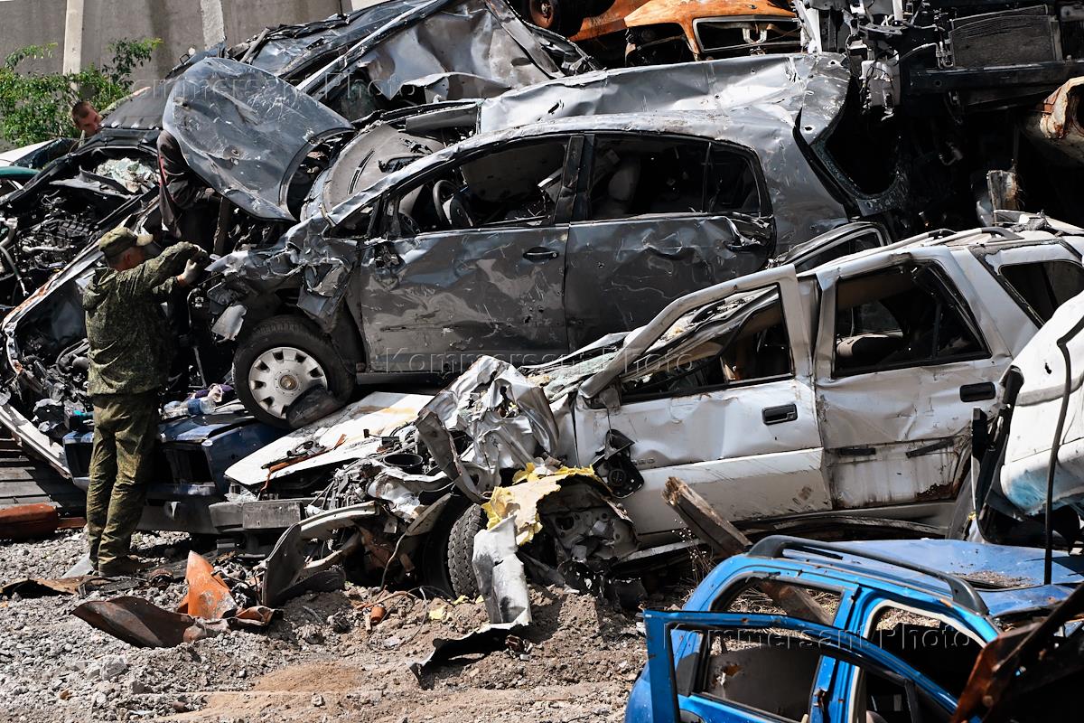 Ситуация в Мариуполе. Площадка разбитых и обстрелянных автомобилей, после боевых действий в городе.