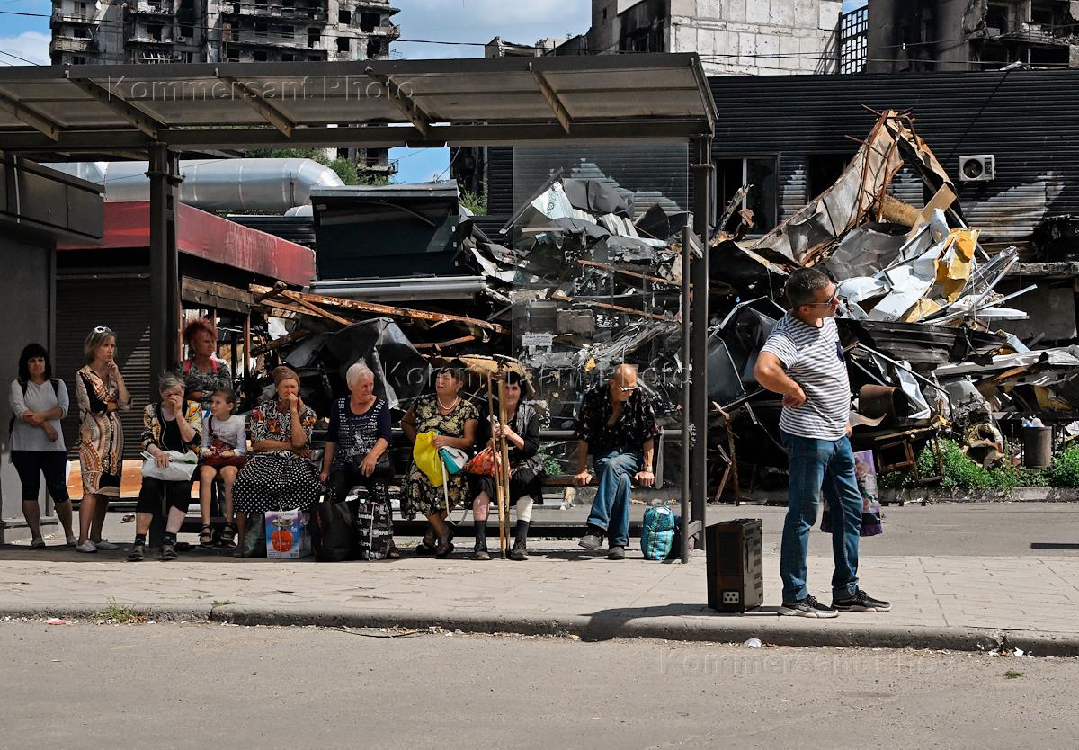 Ситуация в Мариуполе. Жители города на остановке городского транспорта на фоне разрушенного дома, после боевых действий.