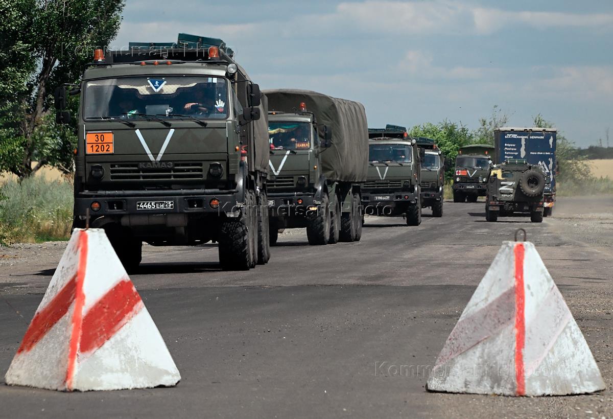 Checkpoint on the border of the DPR and Russia. Genre photography. A line of trucks at the entrance to Russia.