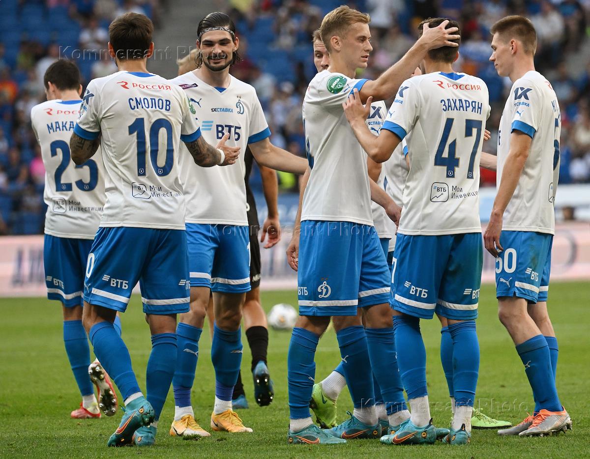 Мир - Российская Премьер-Лига (РПЛ) 2022/2023. 2-й тур. Матч между командами "Динамо" (Москва) - "Торпедо" (Москва) на стадионе "ВТБ Арена". Игроки команды "Динамо" во время матча.