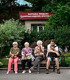 День памяти актера, музыканта Владимира Высоцкого на Ваганьковском кладбище. Жанровая фотография. Люди на скамейке на кладбище.