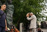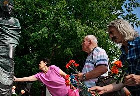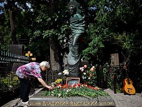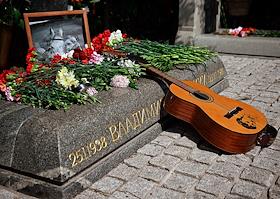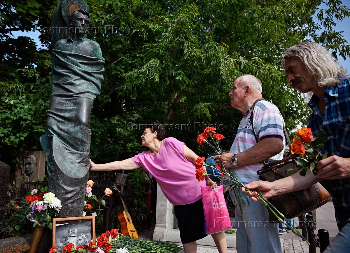 День памяти актера, музыканта Владимира Высоцкого на Ваганьковском кладбище. Возложение цветов к памятнику на могиле Владимира Высоцкого. Скульптуры является Александр Рукавишников, а архитектором — Игорь Вознесенский