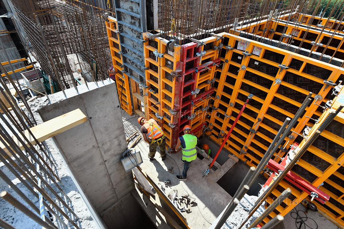 Construction of the residential complex "Dostizhenie" of the management company Sminex. Genre photography. Workers during the installation of formwork.
