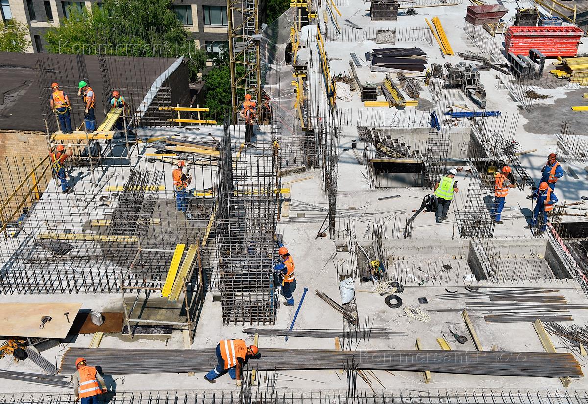 Строительство жилого комплекса "Достижение" управляющей компании Sminex. Жанровая фотография. Рабочие во время установки опалубки.