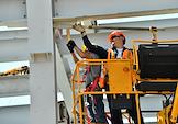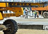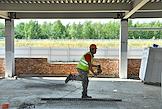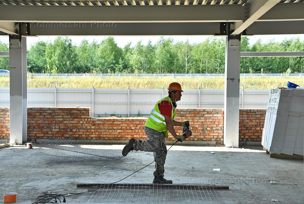 Строительство завода по переработке полимеров в деревне Поцелуево - совместный проект компании "Эколайн" (оператор по вывозу мусора в Москве и Подмосковье) и компании "Втор-пласт" (переработка пластиковых отходов). Жанровая фотография. Рабочие на строительной площадке.
