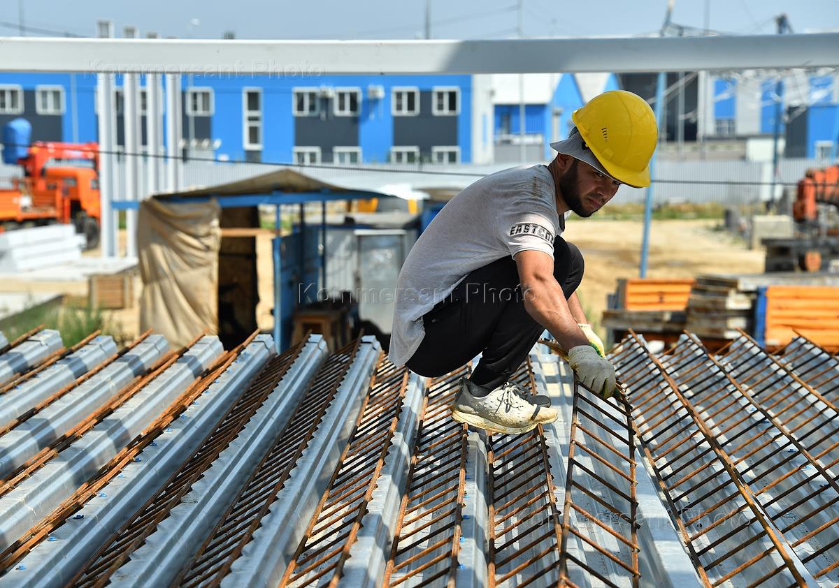 Строительство завода по переработке полимеров в деревне Поцелуево - совместный проект компании "Эколайн" (оператор по вывозу мусора в Москве и Подмосковье) и компании "Втор-пласт" (переработка пластиковых отходов). Жанровая фотография. Рабочие на строительной площадке.